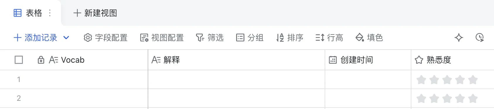 先创建一个名叫 “VocabBuddy”的多维表格,表头包含:Vocabulary、释义、创建时间和熟悉度。