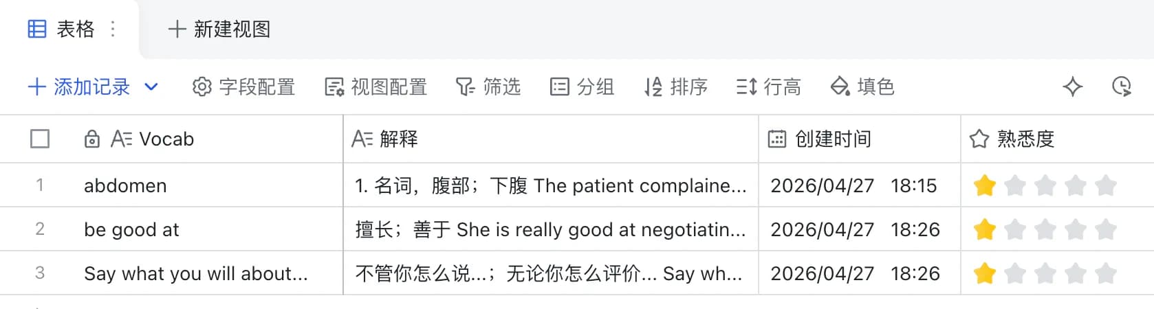 现在我们每次查询单词和短语后,除了得到一个格式化的输出,还会在飞书表格中看到一条新的记录。