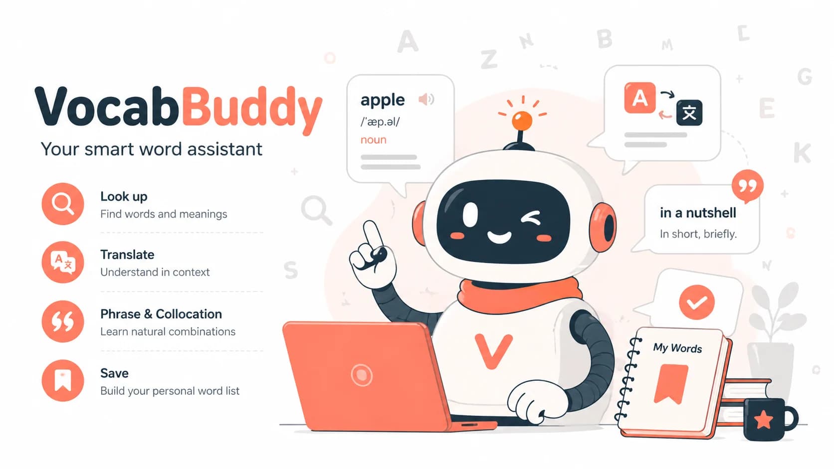 先给这个 Skill 取一个名字,因为主要是针对单词、短语的学习助手,就叫 VocabBuddy 吧。